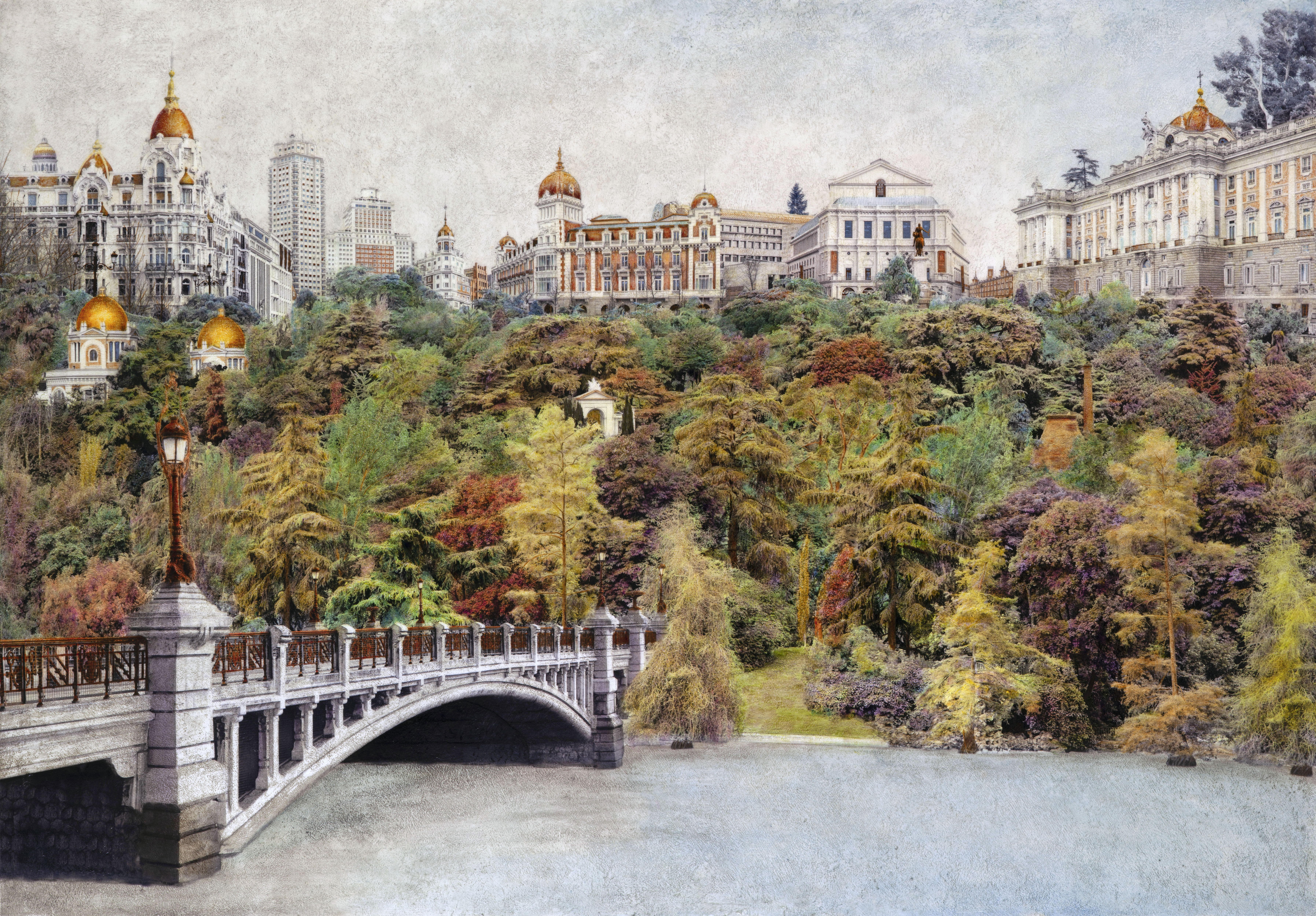 Madrid viewed from the West transforms into a visionary city where nature and architecture coexist in harmony. This imagined landscape highlights the Queen Victoria Bridge, a hidden gem of architectural beauty, bridging the urban and natural worlds. The painting captures a delicate balance between the city's structure and the embrace of lush greenery, inviting reflection on an ideal urban symbiosis. Through subtle color harmonies and thoughtful composition, the work redefines Madrid as a place where human creation and the environment flourish together.