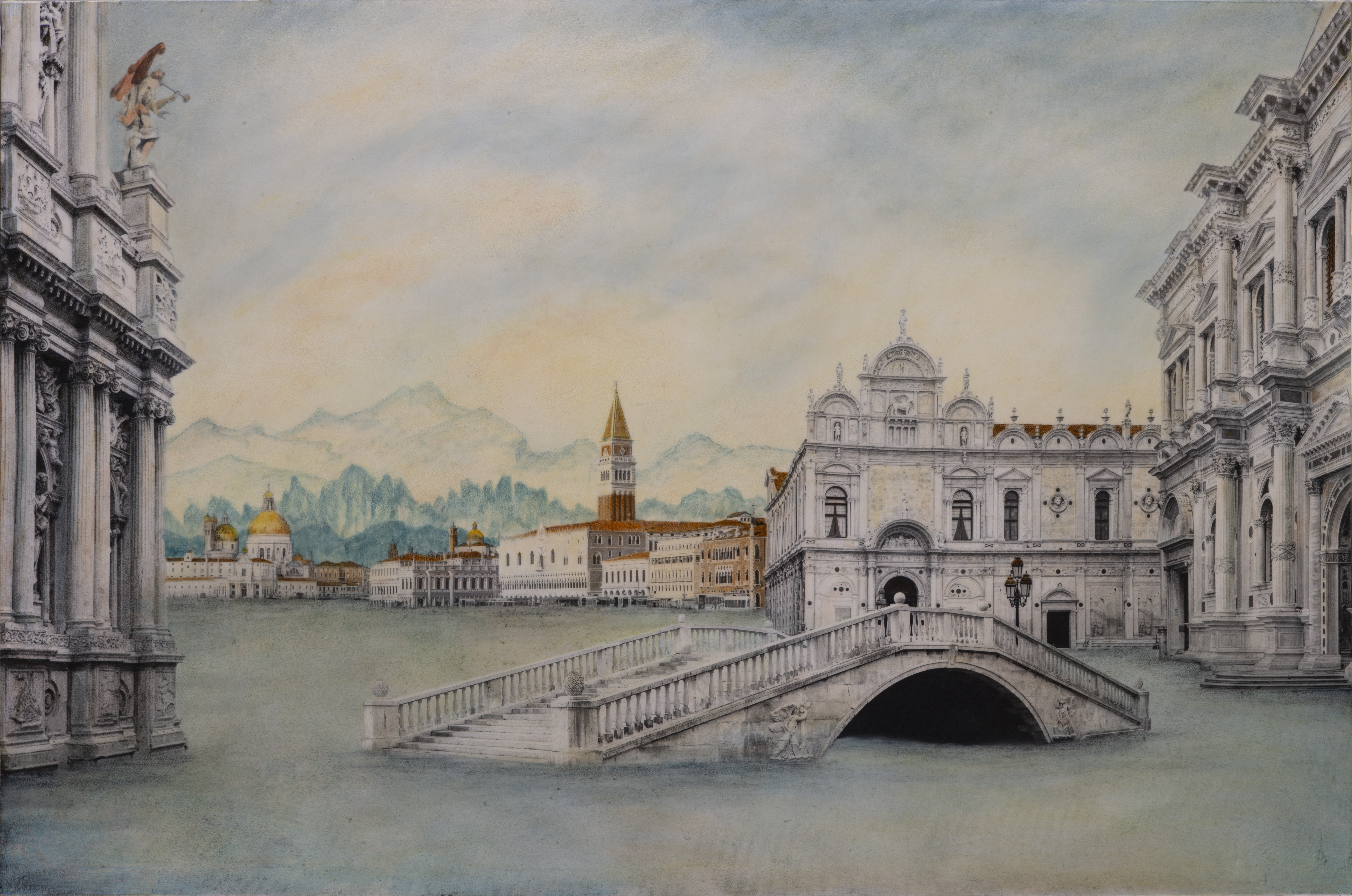 Capriccio Sul Canal Grande captures a visionary reimagining of Venice’s iconic waterway, blending architectural precision with a dreamlike atmosphere. The composition balances familiar landmarks with imaginative elements, suggesting both the city’s timeless beauty and its fragile relationship with nature and time. Through delicate interplay of light and shadow, and a nuanced palette, the work evokes a contemplative mood of transformation and persistence. The painting is a work in progress, reflecting an ongoing dialogue between reality and artistic vision, where tradition meets innovation in a vibrant urban landscape.