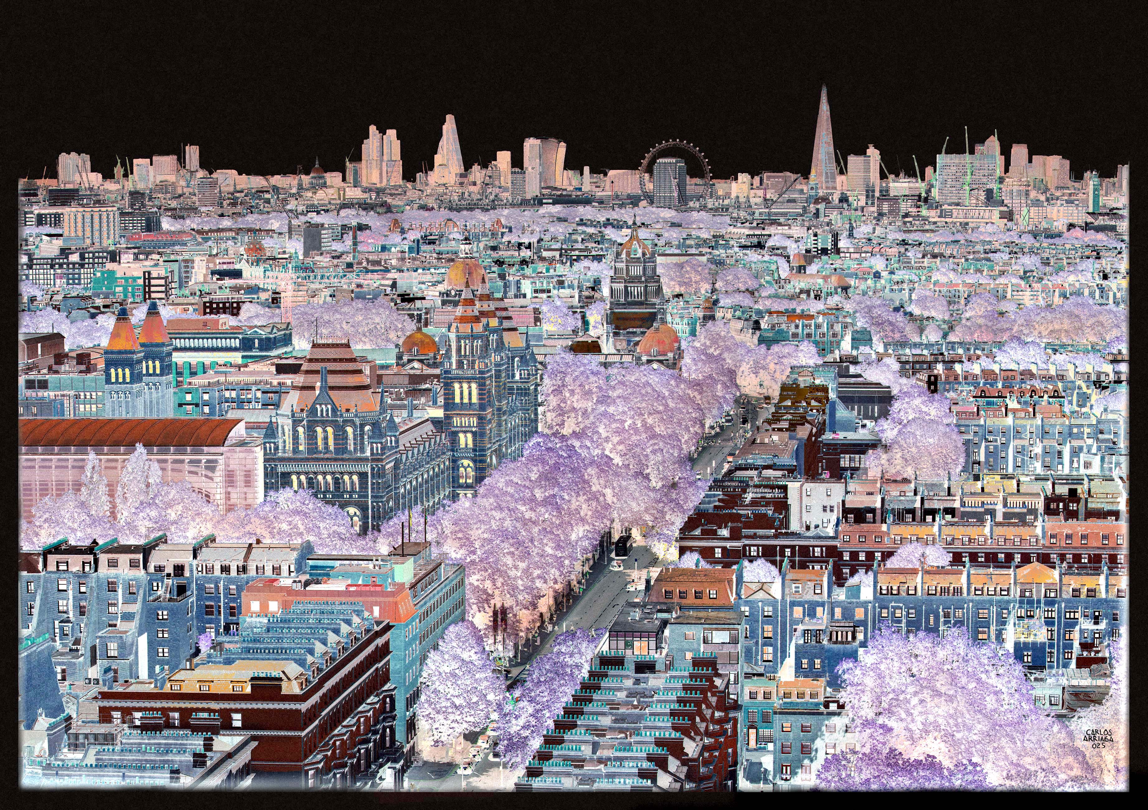 These cityscape views are the magical result of extensive research and both intellectual and hands-on work with the computer. The urban landscape remains recognizable, yet it is completely transformed through light and color. This is a unique technique in the world, one that Carlos knows how to master brilliantly.