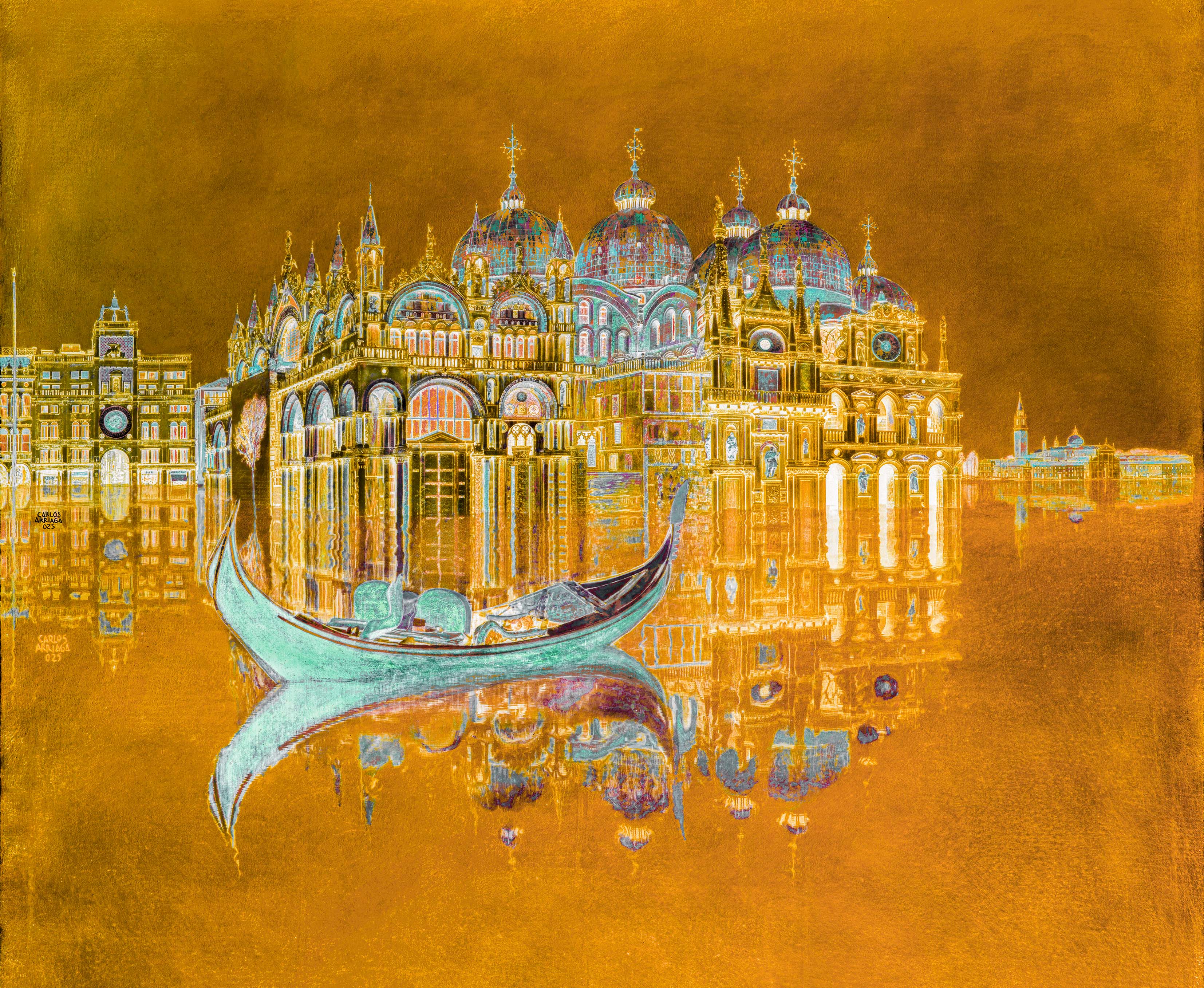Golden Basilica captures a luminous urban landmark bathed in warm, radiant light. The painting transcends literal representation, offering a shimmering interpretation where gold tones dominate, imparting a sense of timelessness and spiritual resonance. Through layered brushwork, the interplay of light and shadow evokes a majestic presence that invites quiet contemplation. This artwork blends architectural form with an almost ethereal glow, highlighting the intersection of human creation and transcendent beauty.