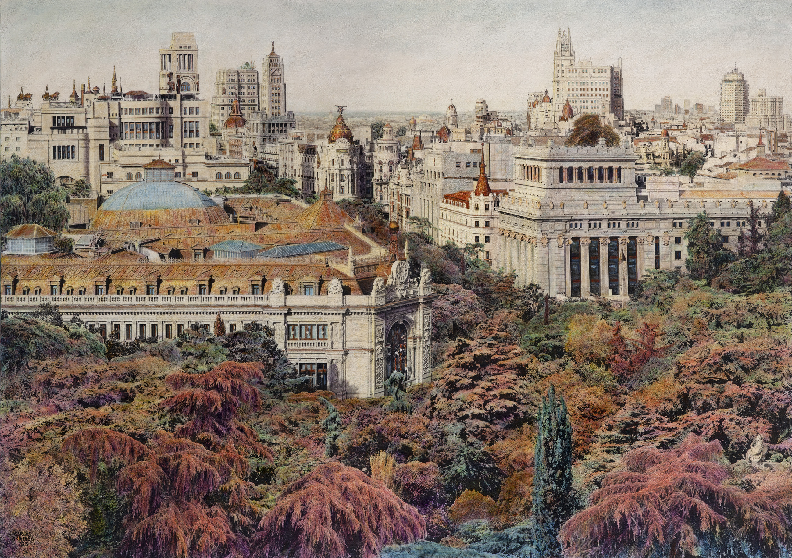 Oil and pencil on black and white photo- grisaille. My painting style is a constant dialogue between the city and nature. In my works, the urban landscapes of Madrid are not shown in their usual form; they are surrounded and transformed by an exuberant nature that seems to reclaim its space. Iconic buildings, streets, and squares that many recognize are immersed in a lush, green environment, as if nature had begun to take back what once belonged to it.
