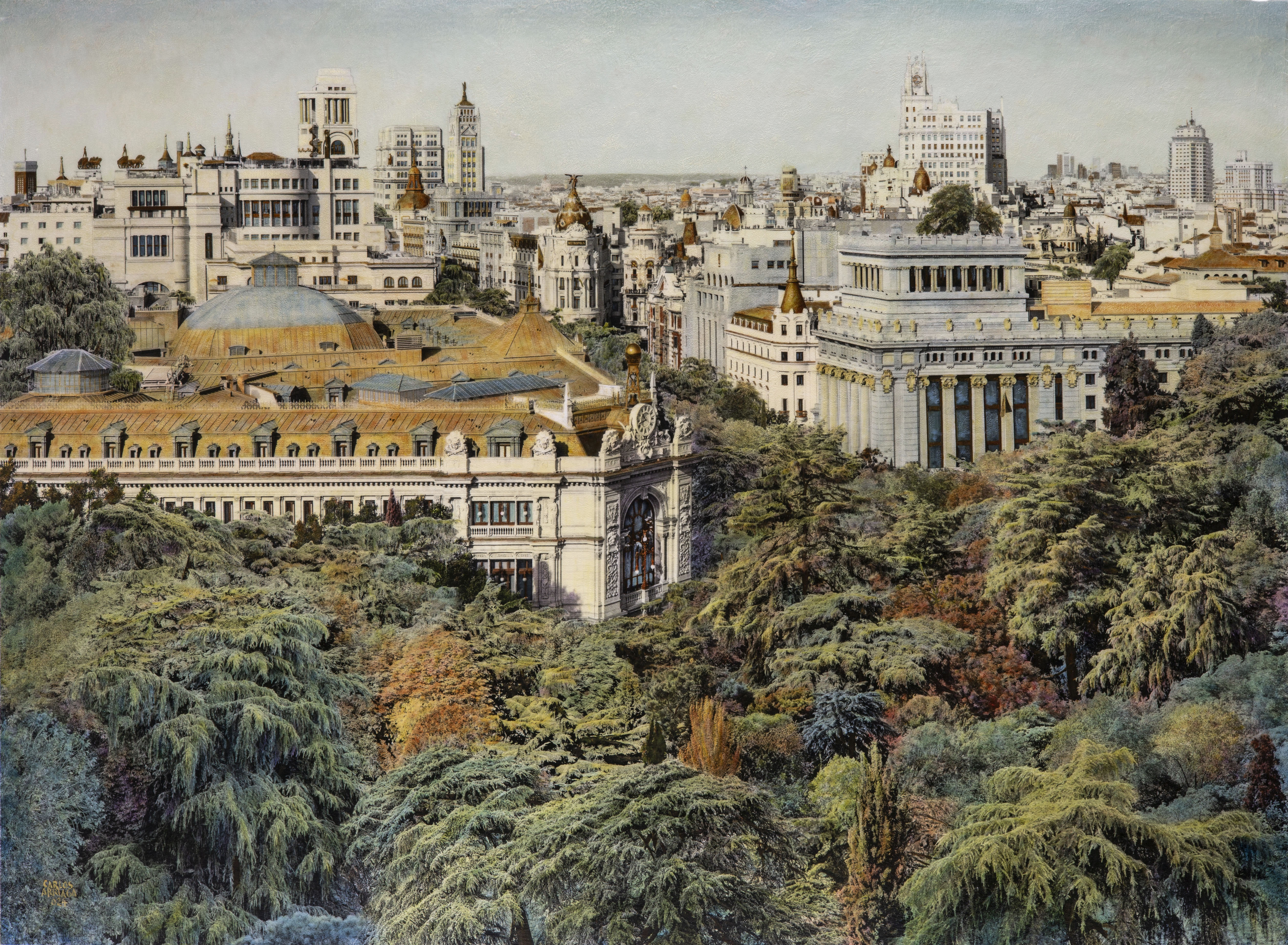 En mis obras, los paisajes urbanos de Madrid no se muestran en su forma habitual, en cambio, están rodeados y transformados por una naturaleza exuberante que parece reclamar su espacio. Edificios icónicos, calles y plazas que muchos reconocen se ven inmersos en un entorno verde y frondoso, como si la naturaleza hubiese comenzado a recuperar lo que una vez fue suyo. Para mí, estas imágenes no son solo visiones estéticas, sino una llamada a imaginar un futuro donde las ciudades y la naturaleza no estén en conflicto, sino en armonía. Este concepto nace de una reflexión sobre el equilibrio que hemos perdido entre lo urbano y lo natural.