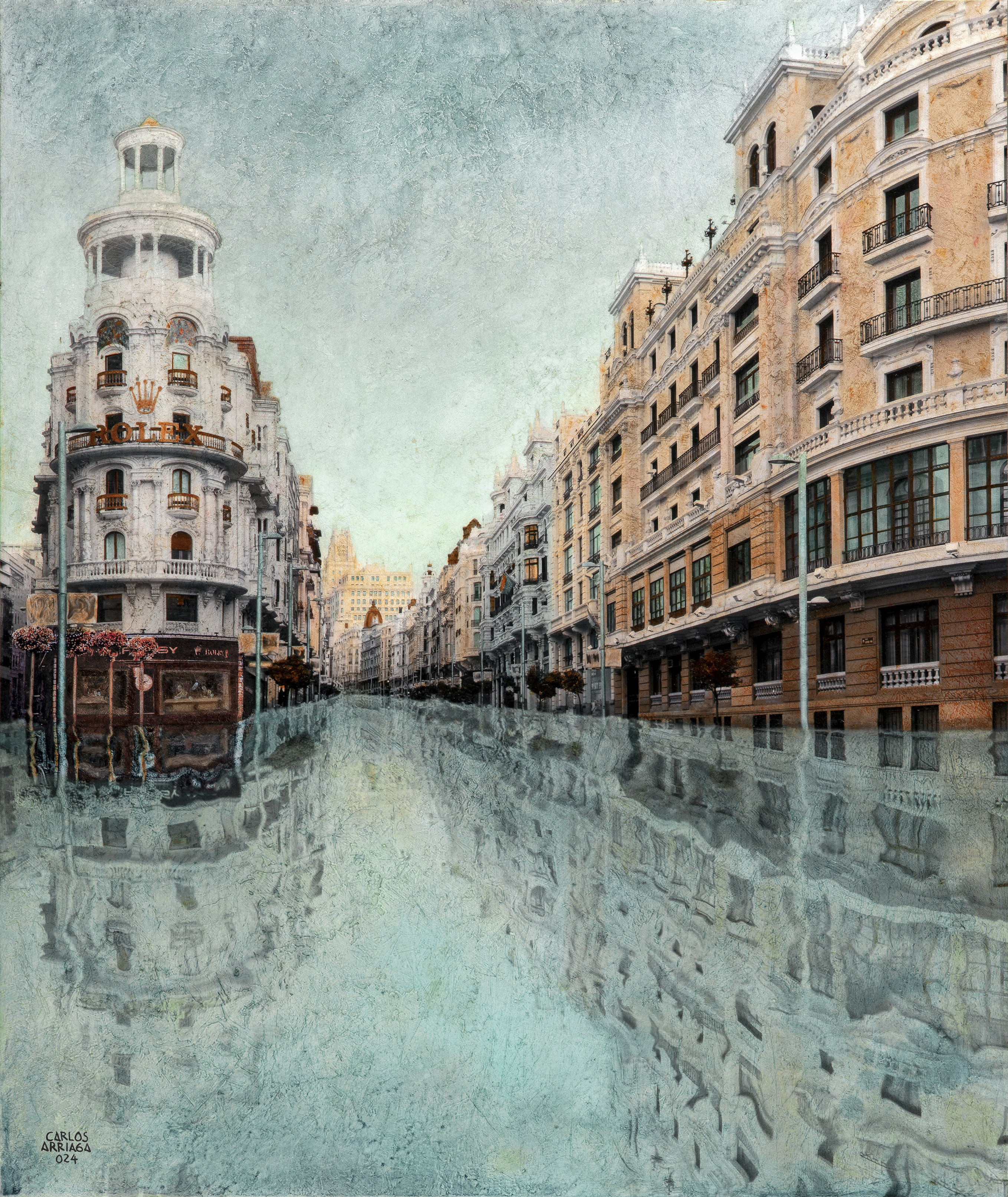 The rising tide becomes a mirror of our mistakes, a quiet warning that the world we built is slowly dissolving beneath us. The iconic Gran Vía transformed, its asphalt replaced by water. What once symbolized progress now reflects uncertainty, a city submerged in its own silence.