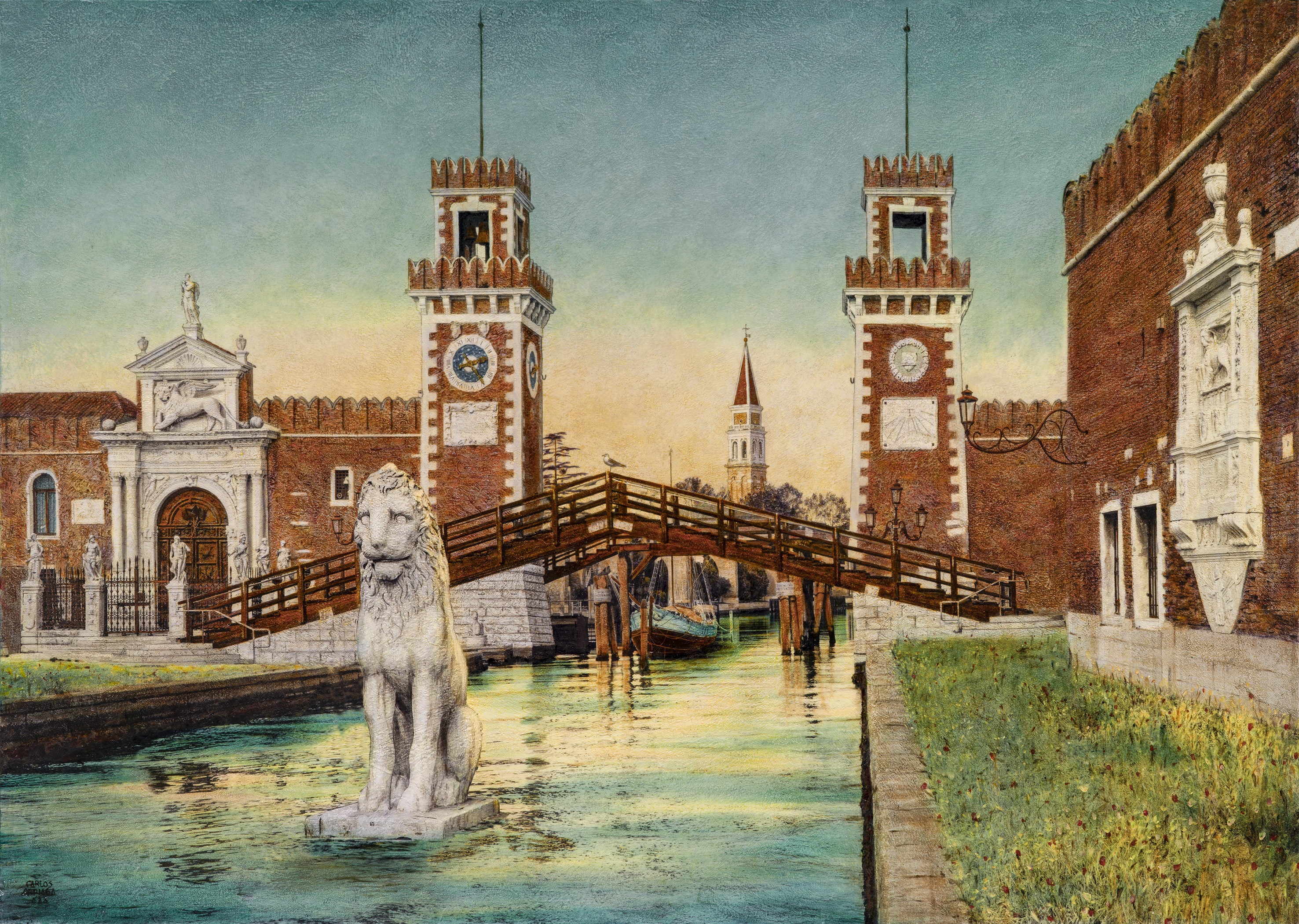 This painting presents the Arsenale di Venezia through the lens of Canaletto’s classic Venetian style, reinterpreted with subtle enhancements for balance and harmony. The composition captures the intricate architecture bathed in soft, luminous light, evoking the timeless spirit of Venice. Delicate brushwork and refined color tones pay homage to Italian Baroque techniques, blending historical reverence with a modern sensibility. The work invites reflection on the enduring beauty and cultural significance of this iconic maritime landmark.