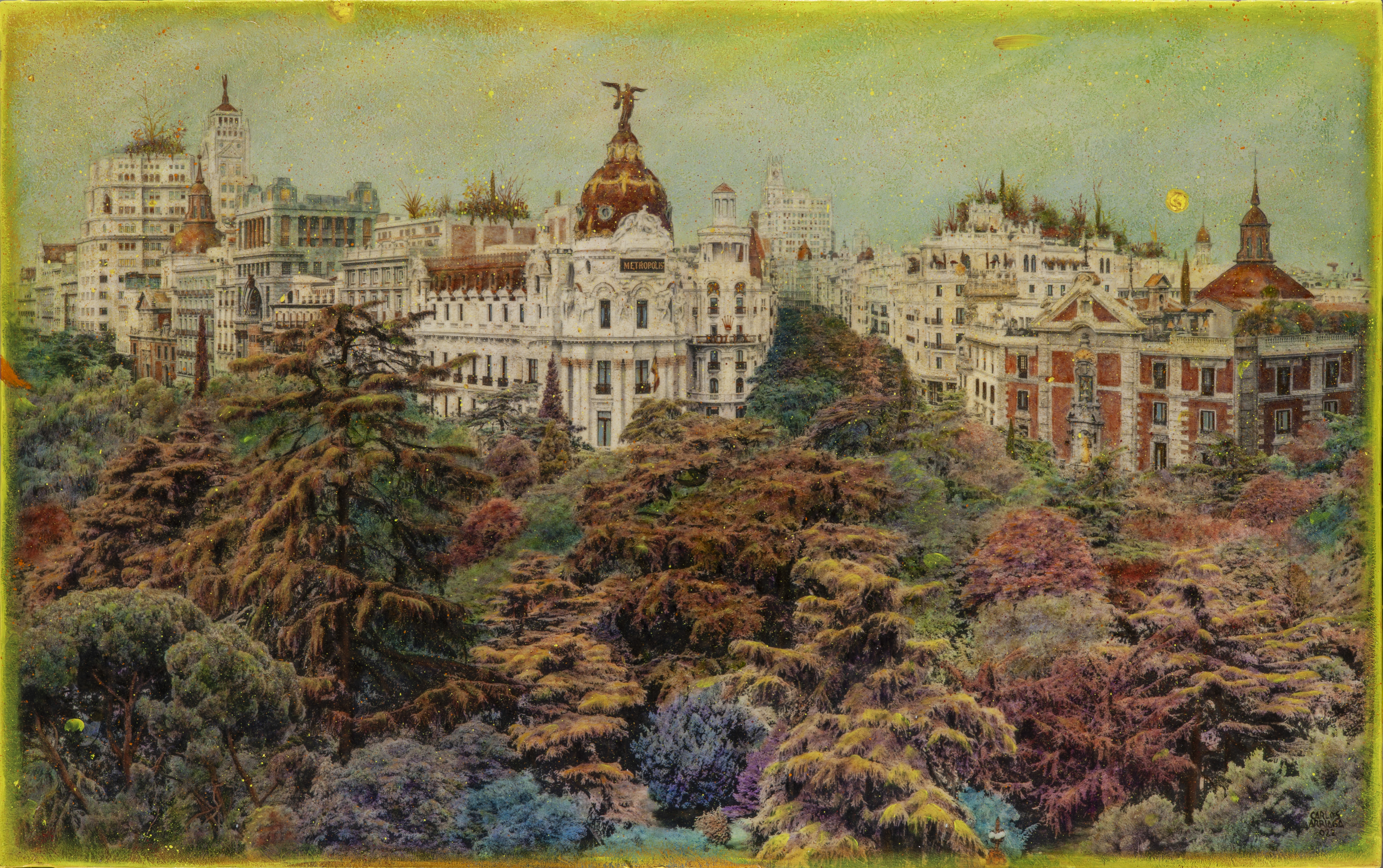En esta obra, la ciudad aparece envuelta y dominada por la naturaleza, que la rodea y la reintegra en un ciclo de transformación y armonía. Los elementos urbanos, reconocibles pero alterados, conviven con una vegetación exuberante que reclama espacio y vida. Este diálogo entre lo construido y lo orgánico invita a reflexionar sobre el equilibrio necesario entre el ser humano y el entorno natural. La técnica combina texturas y colores que realzan la fusión de ambos mundos, creando una atmósfera serena pero cargada de significado.
