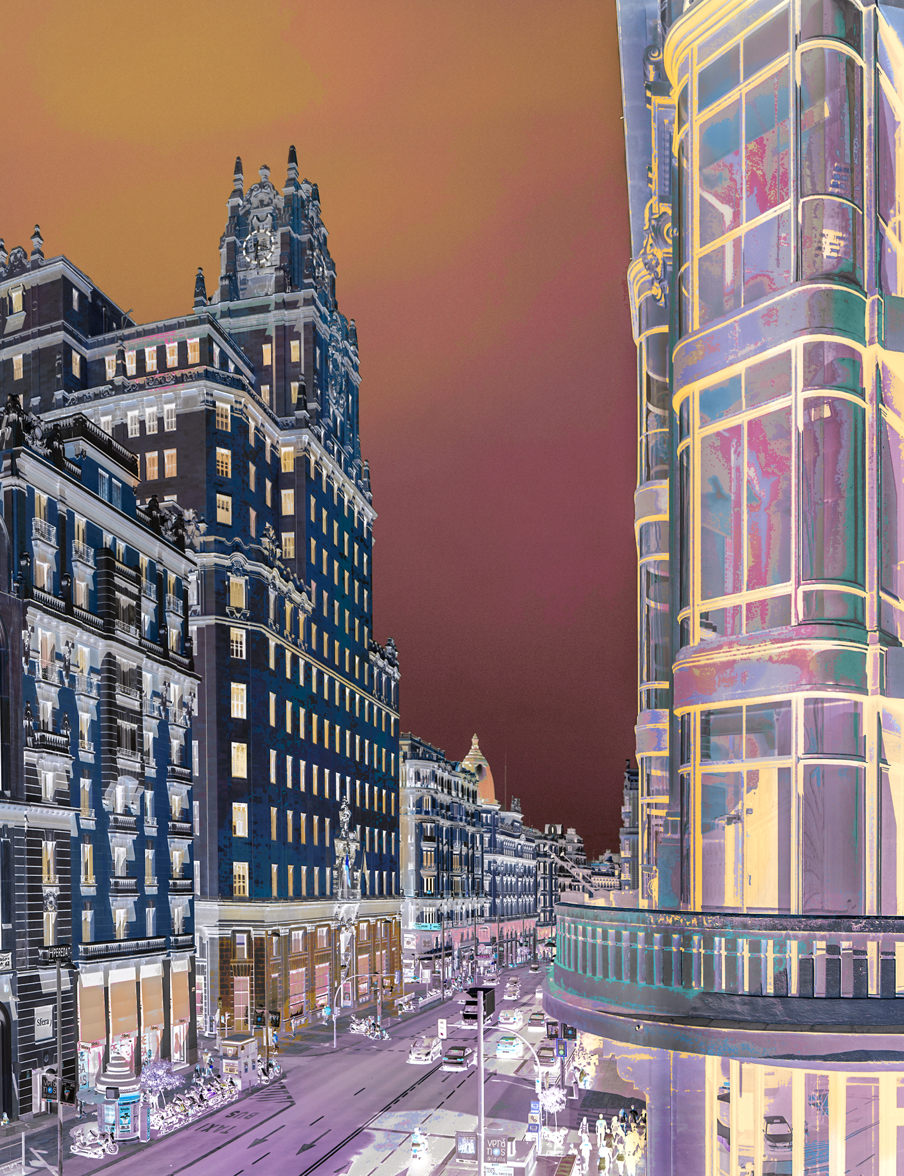 This series emphasizes on the legacy of industrialization and its silent cost: the warming of our world. The port, the chimneys, the factories—symbols of progress—now speak of disruption, excess, and fragility. Each photograph reveals a world upside down. They have been created through a process of inversion, negatives turned into positives, where light becomes shadow and colors erupt into explosive, unreal skies. These skies, often darkened, burning, or almost surreal, are not mere aesthetic choices; they are metaphors for the state of our atmosphere, disturbed, altered, and transmuted by human intervention. What remains are landscapes of a post-industrial New York, at once powerful and unsettling, where light and shadow exchange roles and the atmosphere itself seems to question us. These works do not shout; they whisper. And in their whisper lies a reminder: the climate is changing, and its memory is longer than ours. Yet their message is clear: How long can we remain indifferent, and will we act before it is too late? Cannary Warf con unos extraordinarios colores y luz.