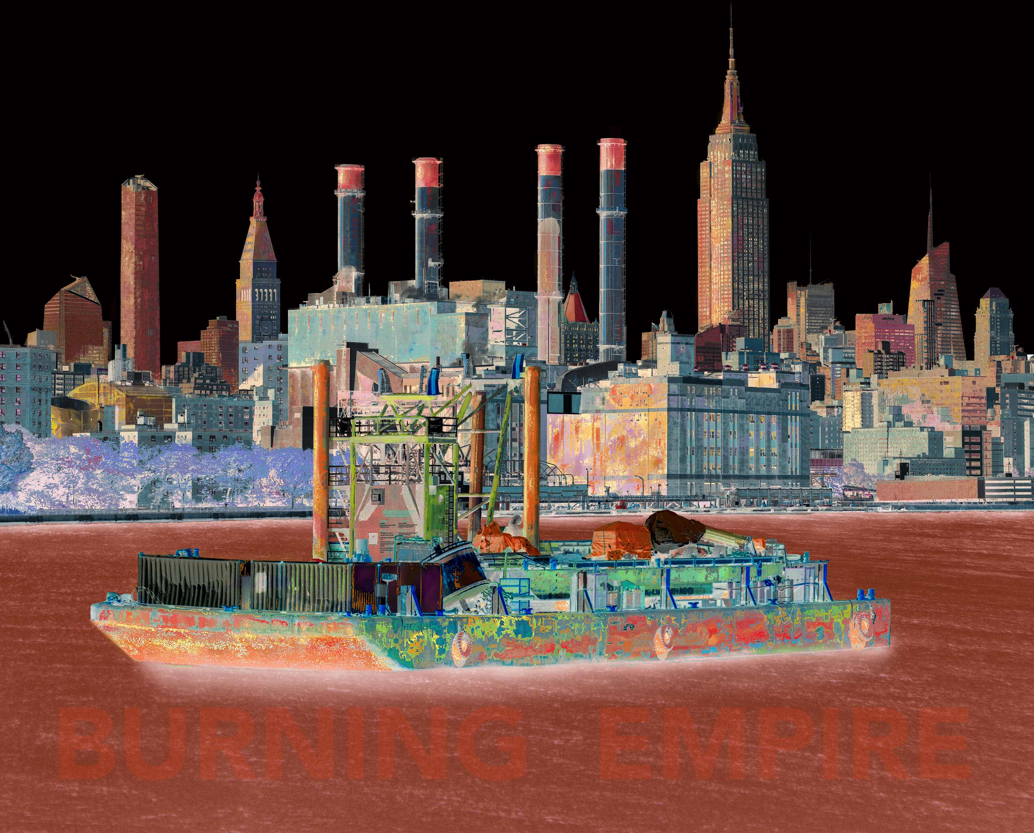 This series emphasizes on the legacy of industrialization and its silent cost: the warming of our world. The port, the chimneys, the factories—symbols of progress—now speak of disruption, excess, and fragility. Each photograph reveals a world upside down. They have been created through a process of inversion, negatives turned into positives, where light becomes shadow and colors erupt into explosive, unreal skies. These skies, often darkened, burning, or almost surreal, are not mere aesthetic choices; they are metaphors for the state of our atmosphere, disturbed, altered, and transmuted by human intervention. What remains are landscapes of a post-industrial New York, at once powerful and unsettling, where light and shadow exchange roles and the atmosphere itself seems to question us. These works do not shout; they whisper. And in their whisper lies a reminder: the climate is changing, and its memory is longer than ours. Yet their message is clear: How long can we remain indifferent, and will we act before it is too late?