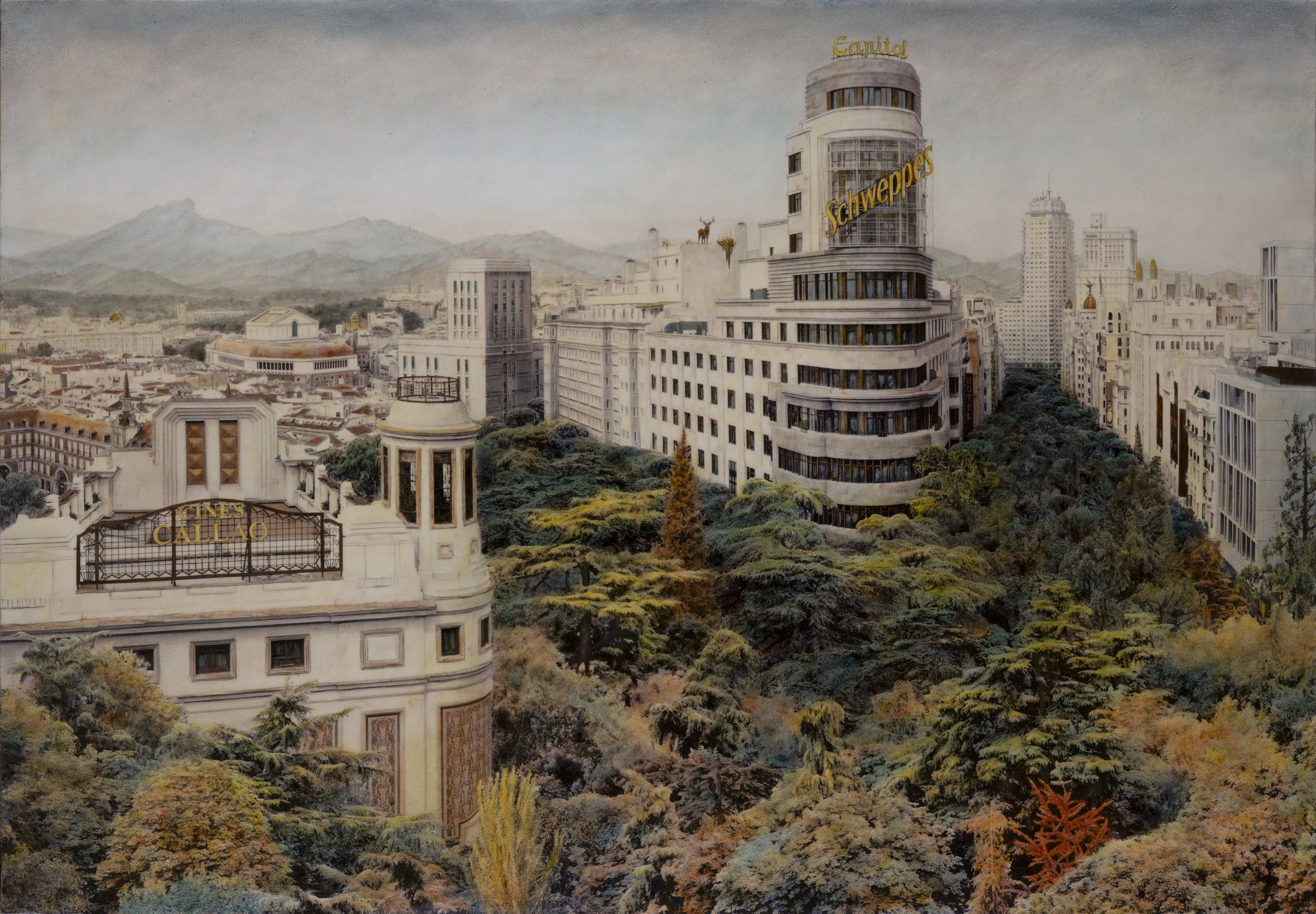 The majestic Quadrigas crown the former Bank of Bilbao, their sculptural forms dominating the skyline like timeless sentinels. Rendered with meticulous detail, these chariots exude strength and grandeur, symbolizing the city’s enduring spirit and historical wealth. The interplay of light and shadow across the statues emphasizes their imposing presence, while the subtle patina hints at the passage of time. This work captures the tension between architectural monumentality and the fleeting nature of urban life.