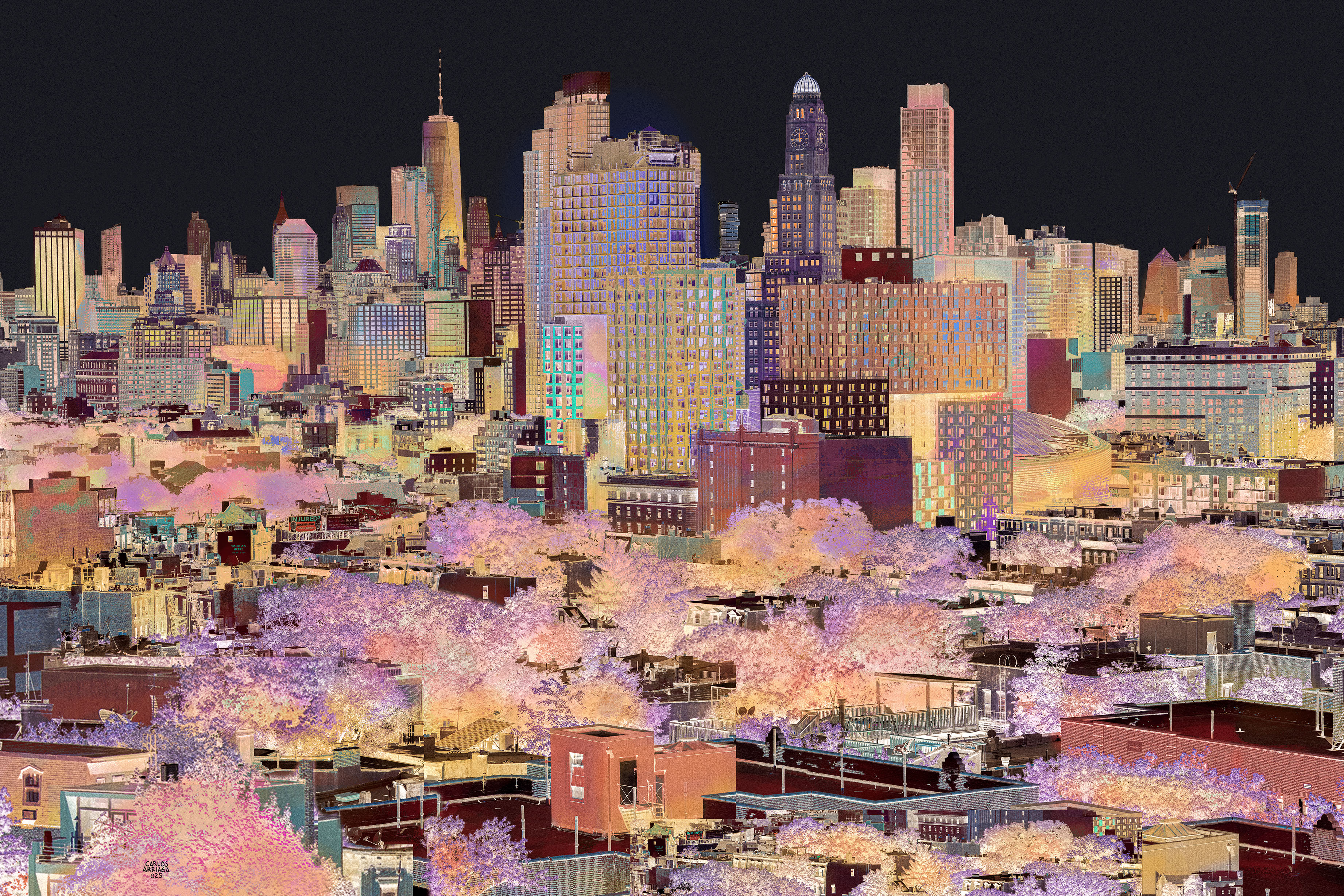 This series explores the legacy of industrialization and its silent consequence: a warming, altered atmosphere. Through an innovative inversion process, photographs transform light into shadow and colors into surreal, explosive skies, reflecting the fragility of post-industrial New York’s Chinatown. The glowing blues and intensified contrasts evoke a cityscape both familiar and transformed—where nature’s disturbance mirrors humanity’s imprint. These ethereal images whisper a warning about climate change, urging reflection before it is too late. Blurring the line between photography and digital manipulation, the work creates a haunting nocturnal vision that is as mesmerizing as it is unsettling.