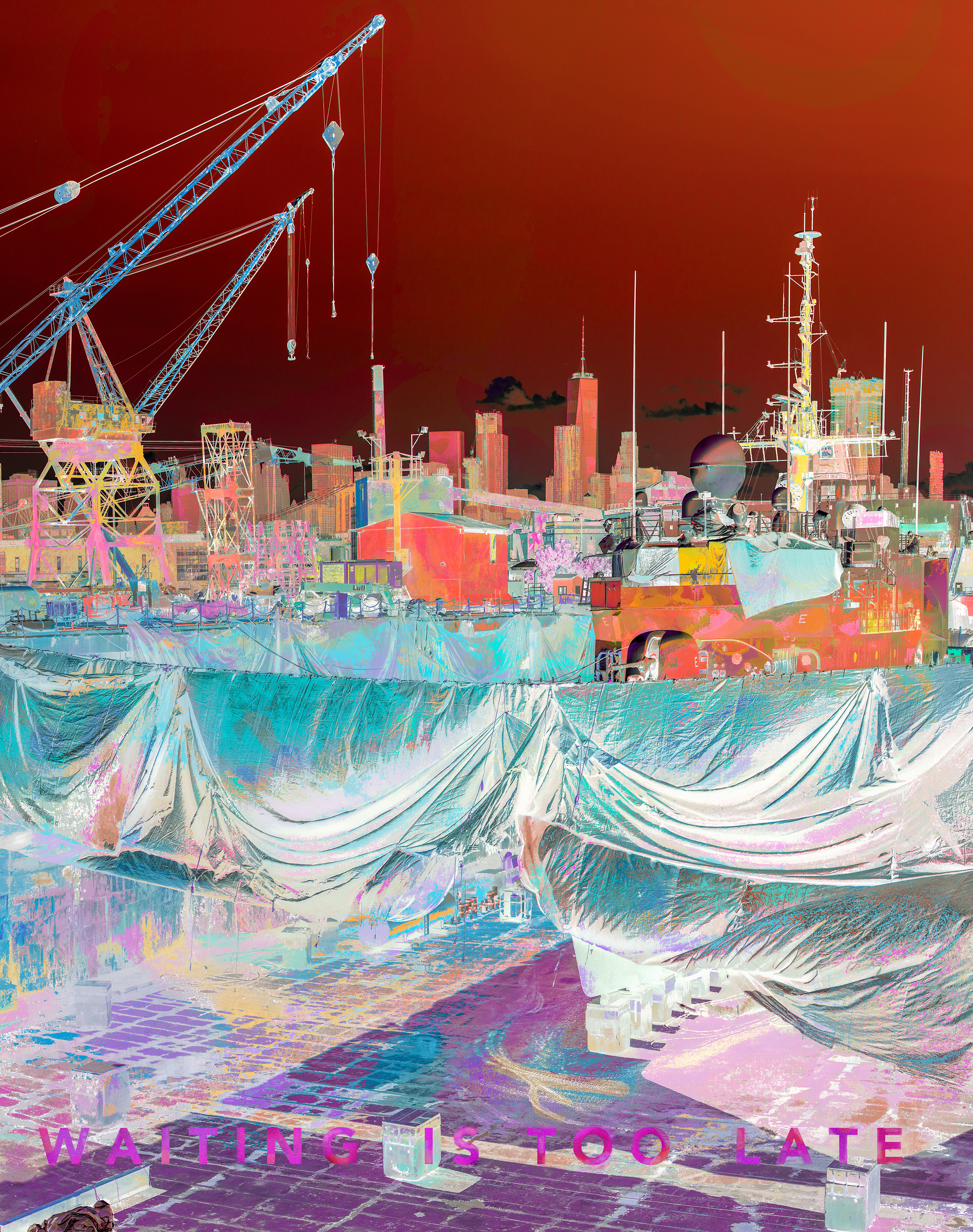 This series emphasizes on the legacy of industrialization and its silent cost: the warming of our world. The port, the chimneys, the factories—symbols of progress—now speak of disruption, excess, and fragility. Each photograph reveals a world upside down. They have been created through a process of inversion, negatives turned into positives, where light becomes shadow and colors erupt into explosive, unreal skies. These skies, often darkened, burning, or almost surreal, are not mere aesthetic choices; they are metaphors for the state of our atmosphere, disturbed, altered, and transmuted by human intervention. What remains are landscapes of a post-industrial New York, at once powerful and unsettling, where light and shadow exchange roles and the atmosphere itself seems to question us. These works do not shout; they whisper. And in their whisper lies a reminder: the climate is changing, and its memory is longer than ours. Yet their message is clear: How long can we remain indifferent, and will we act before it is too late?
